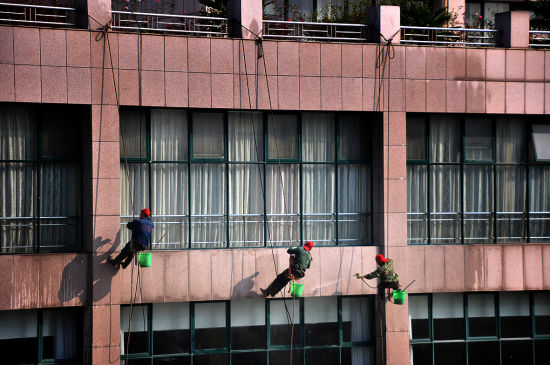 在信陽某區(qū)一高層建筑外,外墻清洗人員“蜘蛛人”向師傅與工友正懸掛在高樓外體上小心且仔細(xì)地清潔外墻和玻璃,毛頭蘸著添加了清潔劑的水在玻璃上掃一遍,然后用刮子把水刮掉,原本臟兮兮的玻璃馬上煥然一新。對(duì)于向師傅而言,這只是他每天固定的工作而已。 一件專業(yè)的工作服,褲子上兩個(gè)鱷魚嘴似的大洞,膠皮手套戴在手上,向師傅的裝束表述著這份外墻清洗工作的臟、累、險(xiǎn)。聽說記者要采訪他,這個(gè)懸掛在樓層外體上的漢子對(duì)著攝影師的鏡頭做了一個(gè)憨厚的笑臉,然后又重新認(rèn)真刷起了外墻和玻璃。 一道刷到底,向師傅收拾起裝備坐電梯重新返回樓頂,移動(dòng)下4厘米粗的安全繩的位置,準(zhǔn)備重新開始另一道。下去前,向師傅熟練地把安全繩綁定在樓頂一個(gè)堅(jiān)固的建筑上,來回反復(fù)拉扯幾下,以確保足夠地安全。十多年的高空作業(yè)讓這個(gè)憨厚且粗獷的漢子心細(xì)如發(fā)。 隨后,向師傅敏捷地抓住樓體外沿,把自己懸掛在通過專業(yè)的打結(jié)手法綁定在安全繩上的木板上,一系列的動(dòng)作一氣呵成。坐好后的向師傅沒有選擇立即下去,又仔細(xì)地把副繩綁好。“之前出過意外,下去前因?yàn)榇笠鉀]有仔細(xì)檢查,主安全繩突然斷了,幸虧有副繩的二次保護(hù),不然后果不堪設(shè)想。人家摔一跤就摔了,我們摔一下那可就沒有再爬起來的機(jī)會(huì)了。”